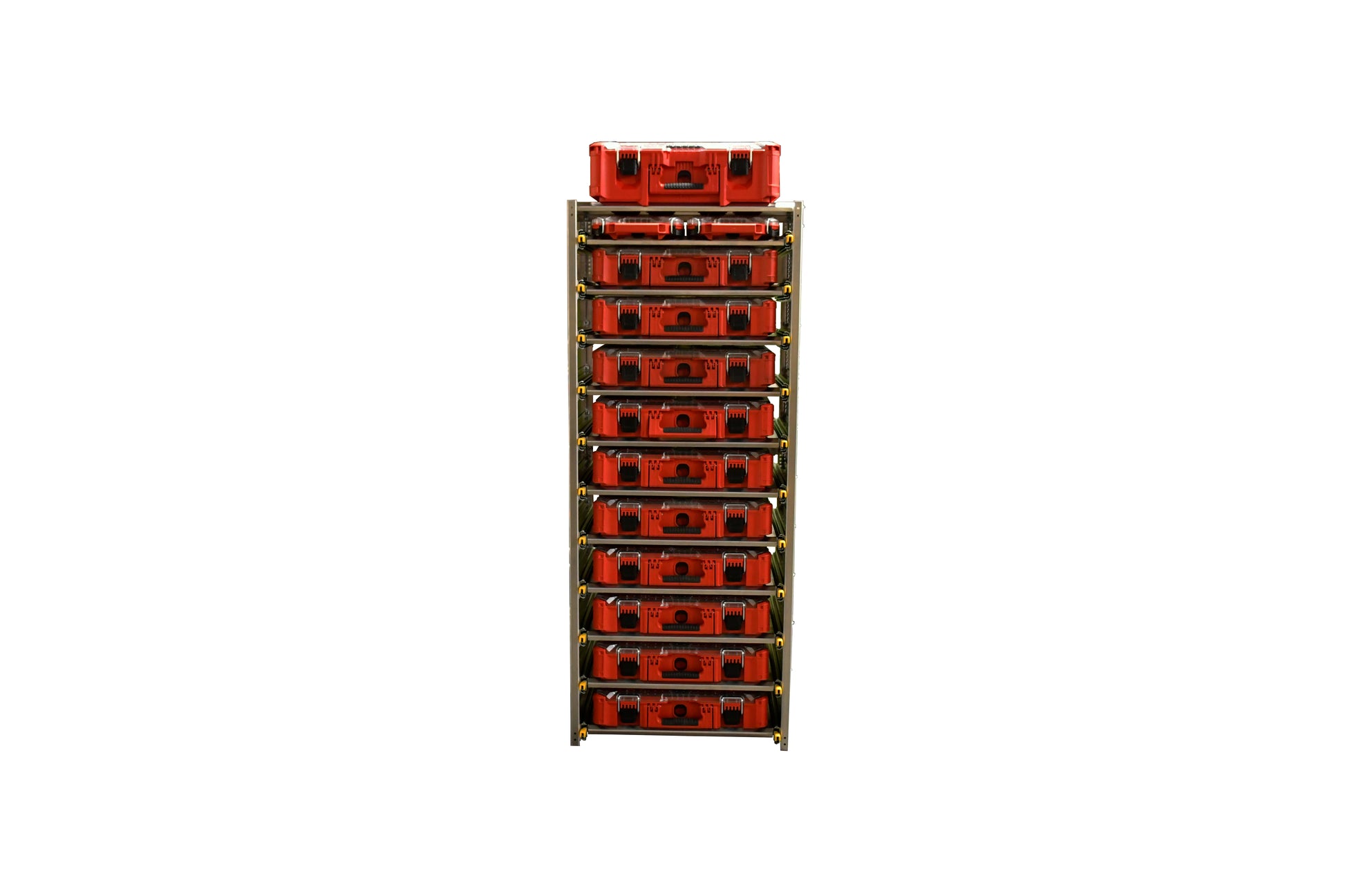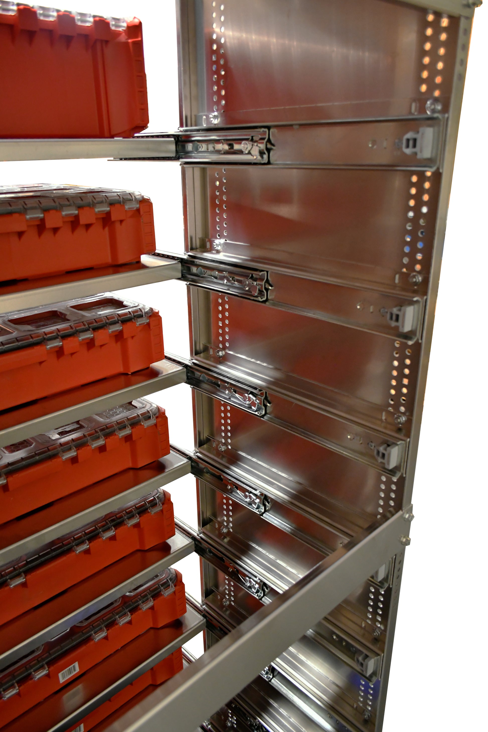 This unit is now available without special order. The top shelf is fixed and doesn't slide, all the remaining shelves come with heavy duty, locking ball bearing slides. The slides lock in and fully extended out so drawer can remain open if you're parked on a side slope. It comes with 2 sides - 8 to 12 shelves - 2 floor mounting brackets and 2 wall brackets plus all the hardware to assemble the unit. Basic hand tools are required for assembly. Bins and installation hardware are not included.